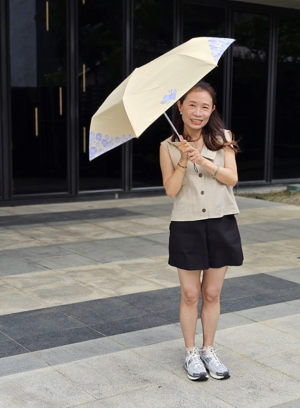 今年夏天我開始試著每天曬十五分鐘太陽,希望有益健康,所以我也把瞬效降溫傘跟美膚傘交替使用,希望透過美膚傘帶來的有益光線,讓我更健康。小小的傘放在包包裡,不占空間也不重,突然下起雨也不怕。