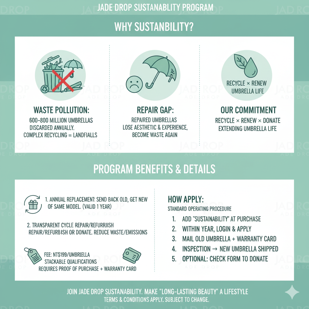 加入 JADE DROP 永續會員,把「好傘長用」變成生活默契。聯繫客服或前往最近門市,立刻參與。