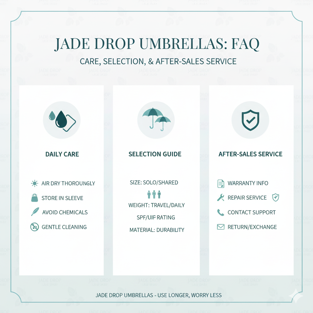 這份 FAQ 蒐整 JADE DROP 點翠傘品用戶最常見的三大問題:日常養護、挑選指南、售後服務。按部就班照做,傘用得更久、更安心。