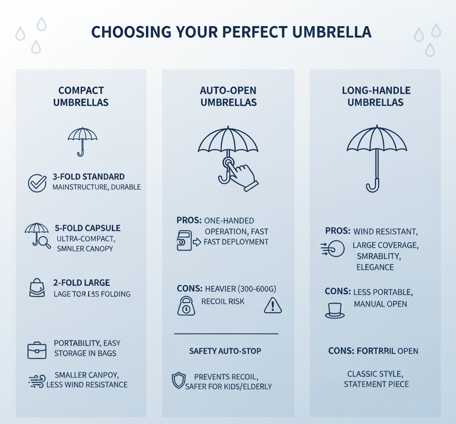 - 結構:以 3 折為主流,成熟穩定;5 折(膠囊)更小巧,但收傘要更細緻;2 折少見,體積較大但更好收合。