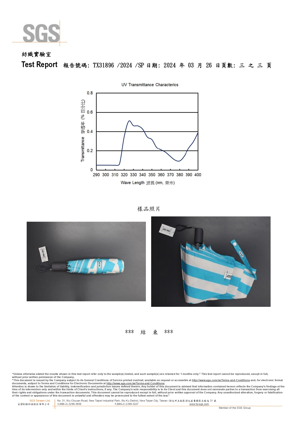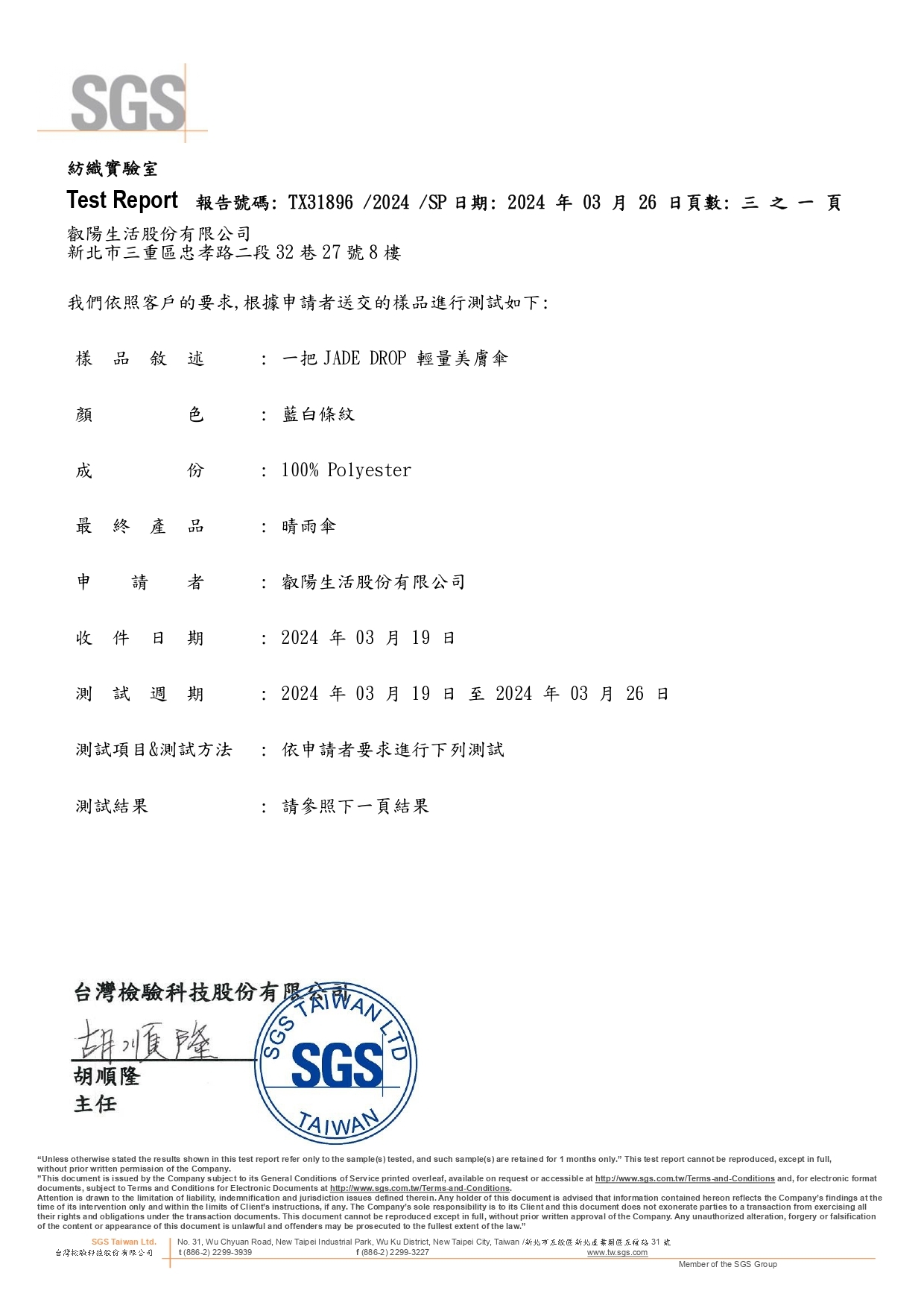 2024 年 3 月,JADEDROP® 將一把藍白條紋的輕量美膚傘,送進 SGS 台灣紡織實驗室。