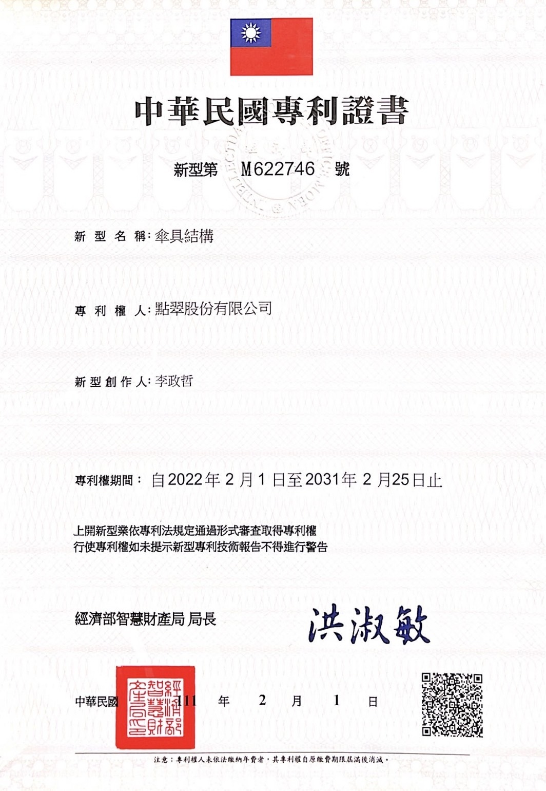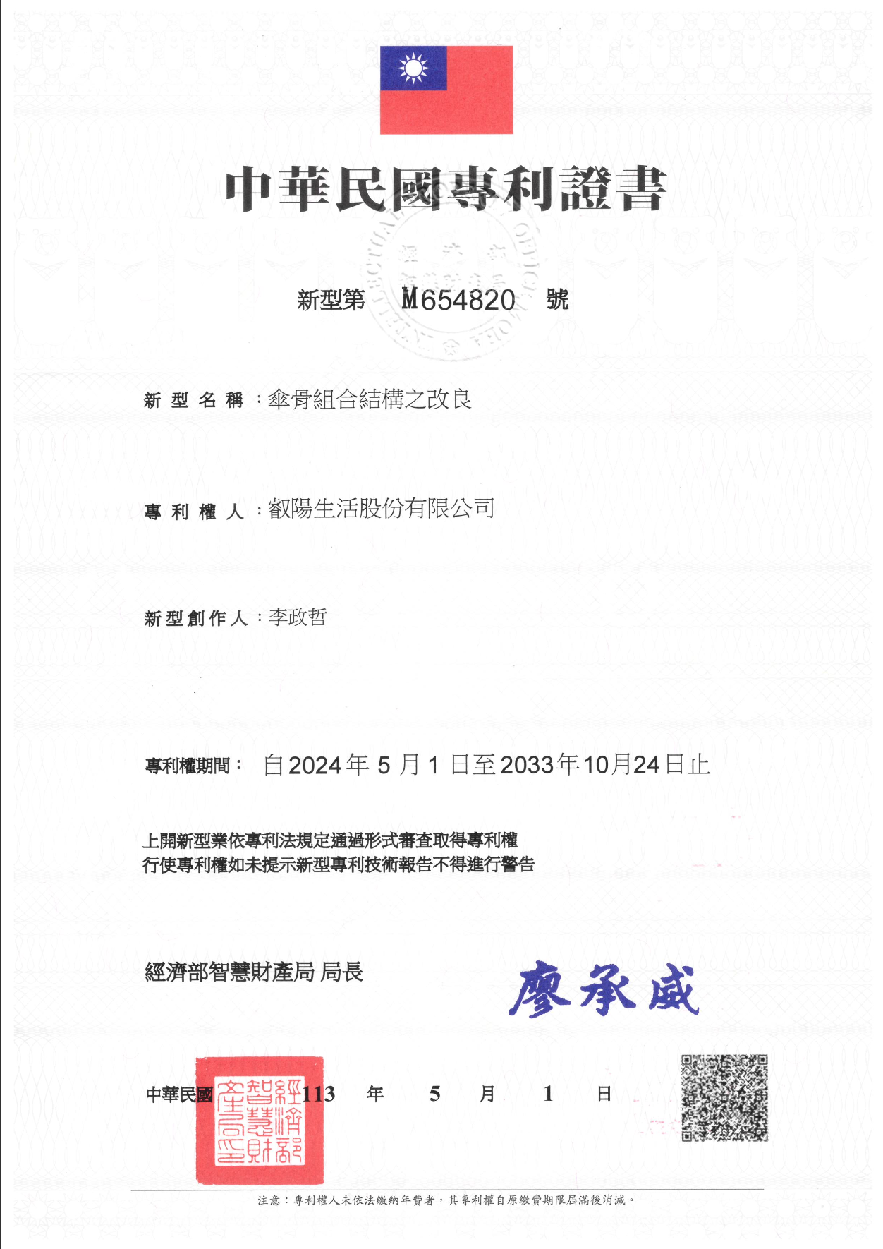 這兩項專利,分別對應我們在傘具結構與機構設計上的創新,