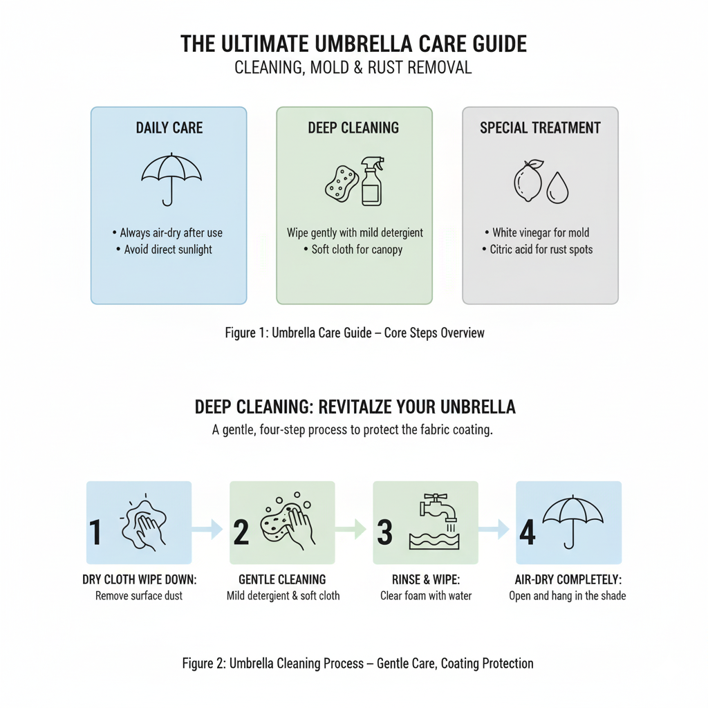 雨傘保養全攻略 清潔、除霉、除鏽一次搞定 • 日常保養:使用後務必陰乾 • 深度清潔:中性清潔劑溫和擦拭 • 特殊處理:白醋、檸檬酸處理霉斑與鏽斑