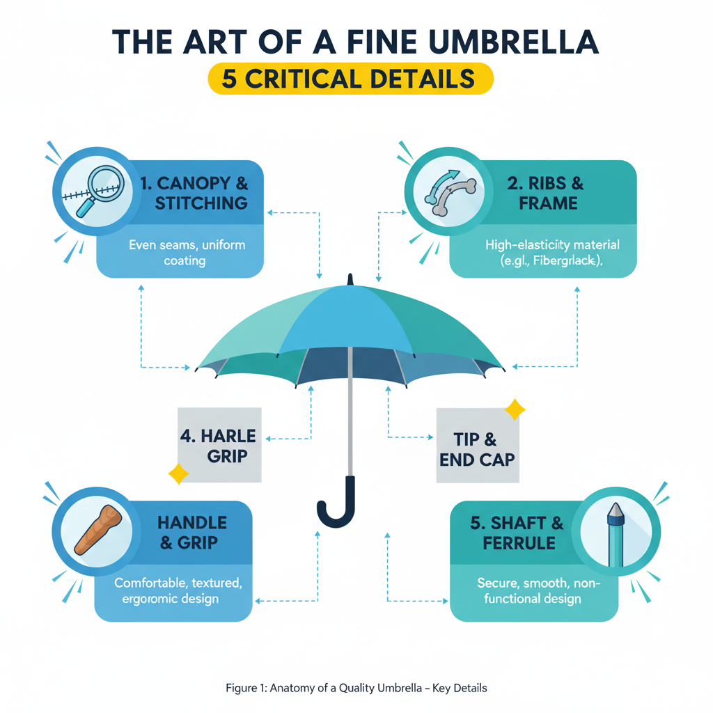 你是否想過,為何有些傘能優雅抵抗強風,有些卻一吹就壞?為何有些傘握感舒適,有些卻處處刮手?答案,就藏在那些您可能從未注意過的「細節」裡。一把完美無瑕的傘,絕非偶然。從傘頭的材質、傘骨的結構,到傘布的車縫,處處都是工藝與科學的展現。本篇將帶您化身為細節控,深入鑑賞一把好傘的五大關鍵細節。