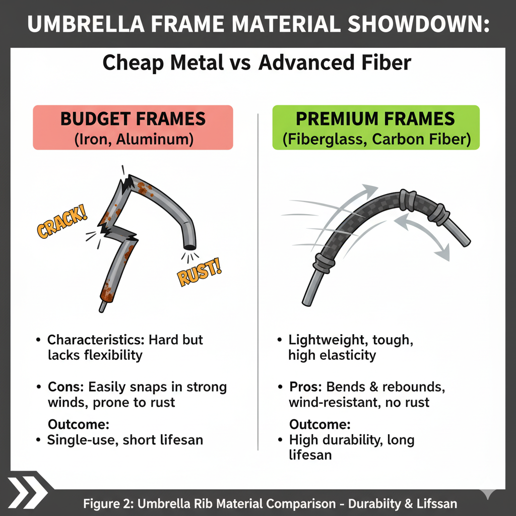 傘骨是決定一把傘耐用度的核心。廉價傘多使用易生鏽、易折斷的鐵或鋁合金,而高品質的傘則不惜成本,採用更優異的材質。