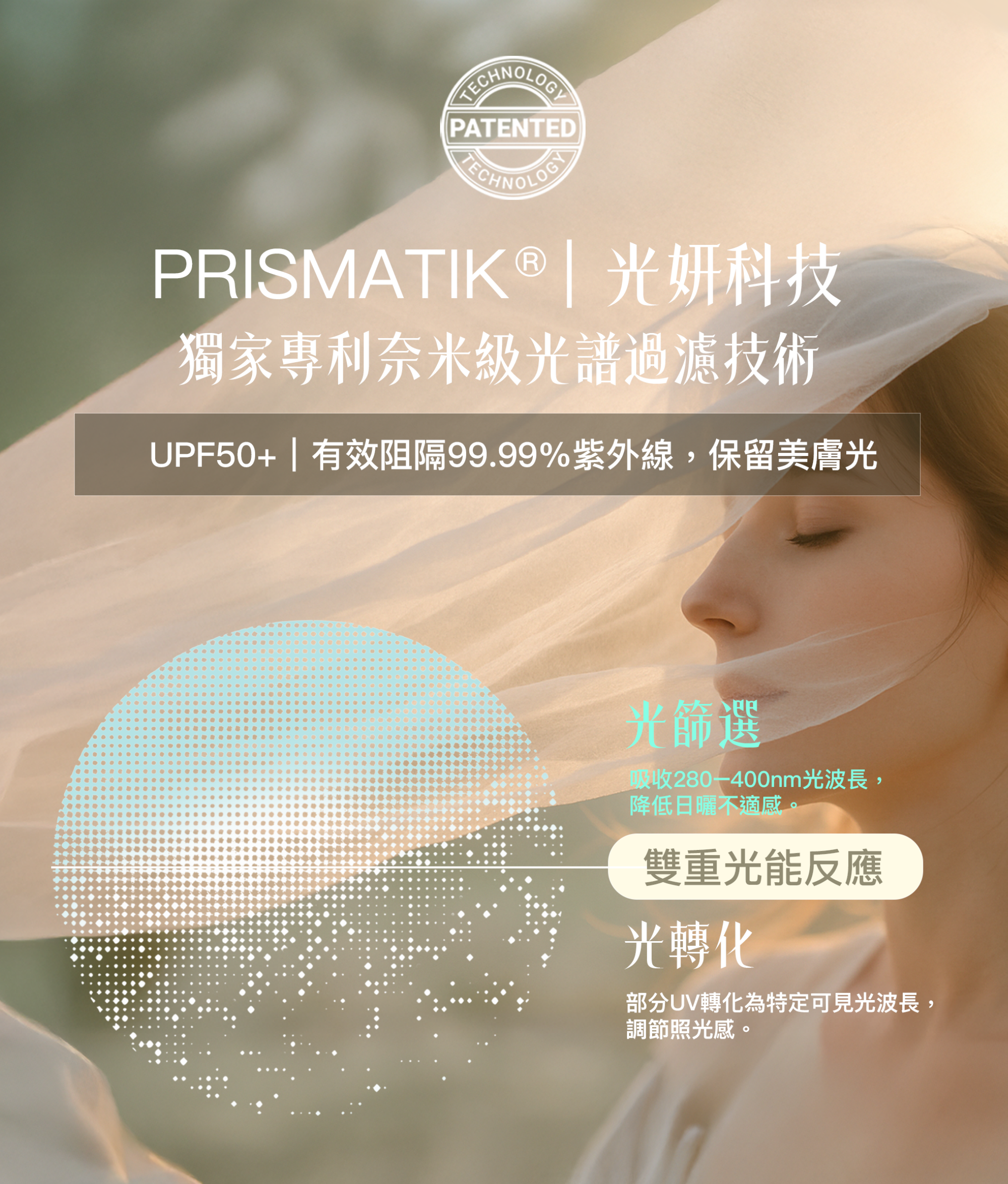 多層膜結構優化光線行為,大幅抑制 UV,並保留更舒適的可見光體驗;長時間外出,肌膚感受較穩定、不躁熱。