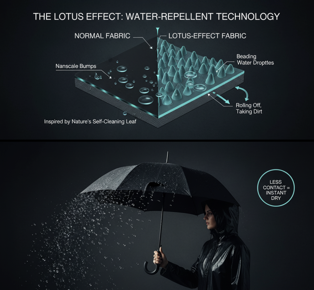 收傘時,濕漉漉的傘總讓人煩惱。超撥水科技的出現,完美解決了這個痛點。其靈感來自於大自然的「荷葉效應」。