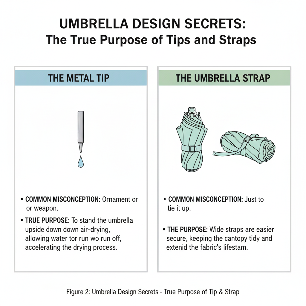 雨傘設計冷知識圖解 傘尖的金屬頭 傘帶的設計 • 錯誤認知:裝飾品或攻擊武器 • 真正用途:方便將傘倒置晾乾, 讓水順著傘尖流下,加速乾燥。 • 錯誤認知:隨便綁綁就好 • 真正用途:寬版的傘帶更易於收納, 且能讓傘收得更整齊,延長傘布壽命。